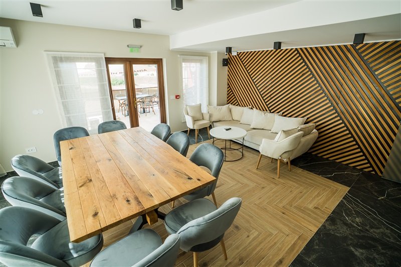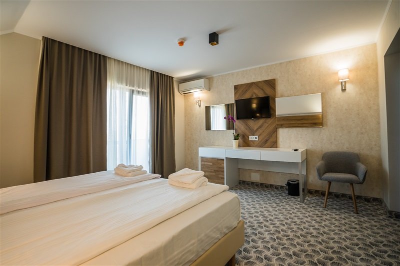 Camere: Pensiunea Palace dispune de: - 3 apartamente - suprafata de 45 mp - dormitor cu pat matrimonial si living cu canapanea extensibila, balcon, aer conditionat, tv cu ecran plat, terasa, minibar, halat de baie, grup sanitar cu cabina de dus. - 9 camere duble decorate intr-un stil elegant cu o suprafata de 25 mp si pat matrimonial. Balcon, vedere la curtea interioara, aer conditionat, tv cu ecran plat, minibar, grup sanitar cu cabina de dus, uscator de par. O parte din camerele duble au un fotoliu pat ce poate fi utiliat de copii ca pat suplimentar contracost;
