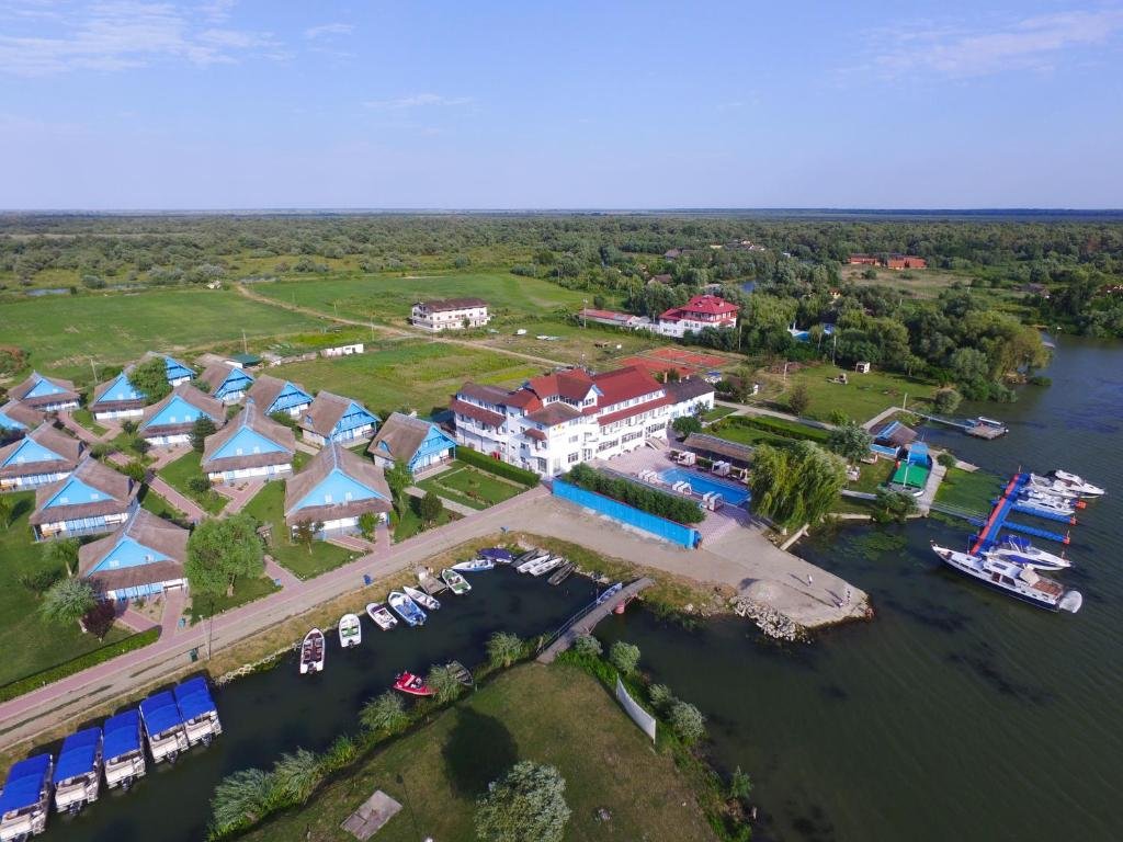 Descriere: Este construit pe o insula de 7 km lungime, in inima Deltei si dispune de 34 camere duble si 2 garsoniere cu jacuzzi la hotel, 10 Vile tip A 3 compuse din 4 camere duble cu canapea extensibila, 5 Vile tip B 3 compuse din cate 2 apartamente, fiecare apartament avand 2 dormitoare, 2 camere de zi cu cate 2 canapele, 2 grupuri sanitare.