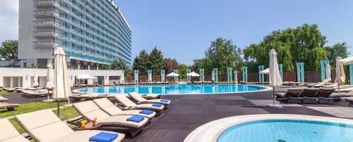 Ana Hotels Europa este situat in statiunea Eforie Nord, este unicul complex de pe litoral ce ofera posibilitatea turistilor de a efectua tratament la exterior, intr-un cadru special amenajat ce include piscina exterioara cu apa sarata din lacul Techirghiol si zona amenajata pentru efecturea masajelor si onctiunilor cu namol. Locatia noastra ofera servicii de cazare cu mic dejun inclus, tratament balnear si terapii wellness intr-un spa de renume - Ana Aslan Health SPA. Hotel Europa este un cadru perfect atat pentru un concediu cu familia cat si pentru organizarea de conferinte, team-building-uri sau chiar evenimente festive (nunti, botezuri, zile onomastice, etc.). Localizare: Se afla la o distanta de doar cateva minute de centrul statiunii si la numai 200 m de plaja administrata (cu sezlonguri si umbrele). Cazare: Hotel Europa are o capacitate de 221 camere repartizate pe 11 etaje, toate cu vedere spre mare si balcon: - camere duble standard (matrimoniale/ twin); - apartamente compuse din living cu canapea extensibila, dormitor si 2 bai; - camere Infinity recent renovate ce includ o terasa cu 2 sezlonguri (aceste camere sunt situate la etajul 1); - 2 camere pentru persoane cu dizabilitati situate la etajul 1; - camere King Deluxe (aceste camere sunt situate la etajul 11) - includ pat matrimonial, o canapea extensibila si dressing. Acestea au o vedere ampla spre Marea Neagra, Lacul Belona sau Lacul Techirghiol. Toate camerele sunt dotate cu sistem de climatizare, internet Wifi si prin cablu, televizor, minibar, seif, telefon, bai cu dus sau cada, uscator de par, papuci si halate. Facilitati: Hotelul pune la dispozitia oaspetilor restaurantul cu splendida sa terasa situata langa gradina si gastronomie autentica (cu preparate internationale si romanesti), 2 baruri (Lobby Bar-in interior si Pool Bar-la exterior), room service, gradina luxurianta unde te poti relaxa in hamace sau pe sezlonguri, 1 piscina cu apa dulce la exterior, Techirgiol Pool (piscina cu apa sarata din lacul Techirghiol, la exterior), 1 piscina cu apa sarata din lacul Techirghiol la interior, jacuzzi, sauna uscata si sauna umeda, sala fitness, plaja administrata cu sezlonguri si umbrele, parcare la exterior si parcare subterana. Facilitati copii: - gratuitate la cazare pentru varste cuprinse intre 0-3 ani (se acorda baby cot in functie de disponibilitate); - loc de joaca in aer liber amenajat in gradina; - Kids Club (loc de joaca in interior cu diverse activitati); - Piscina exterioara pentru copii. Sali de conferinta: Sala Ballroom modulara (3 sectiuni) cu o capacitate de pana la 500 de persoane, capacitate totala - 7 Sali de intalniri cu lumina naturala, foaiere spatioase si terase exterioare amenajate pentru pauza de cafea, bufet standing. Animale de companie: Nu este permis accesul cu animale de companie. Ana Aslan Health SPA: Spa-ul nostru are experienta in tratarea afectiunilor reumatismale, eliminarea stresului, intarirea sistemului imunitar, afectiuni respiratorii, imbinand armonios tratamentele balneare de vindecare si ritualuri antice de relaxare cu proceduri de intinerire si de tonifiere corporala de ultima generatie, fiind dotat cu echipamente medicale moderne. Programele combina factorii naturali de mediu specifici statiunii (aerul cu ionizare intensa, apa sarata si namolul sapropelic din lacul Techirghiol, plante cu efecte curative), cu o multitudine de proceduri clasice. Unic in Romania - Techirghiol Pool - Baza de tratament exterioara cu piscina cu apa sarata din lacul Techirghiol, sezlonguri si zone dedicate masajului cu namol si onctiunilor, totul intr-un ambient exclusivist. Servicii si terapii - terapii cu namol (masaje, onctiuni, bai), kinetoterapie si hidrokinetoterapie in apa sarata, baie cu plante, impachetari cu parafina, electrocardiograma, bioptron, electroterapie, terapia TECAR; - masaje corporale (relaxare, tonifiere, intuitiv, anticelulitic, drenaj limfatic, etc), ritualuri anti-aiging precum ritualul cu aur, tratamente faciale cu produse Thalgo, Biomer, Gerovital; - programe de tratament sau relaxare-infrumusetare personalizate ce se realizeaza in 6,12 sau 18 zile. O noua procedura in materie de infrumusetare pe care o folosim este Oxygenera PRO si presupune utilizarea oxigenului de puritate medicala 98% care sub presiune este introdus in cele mai profunde straturi ale pielii, ajutand la oxigenarea si imbunatatirea respiratiei celulare.