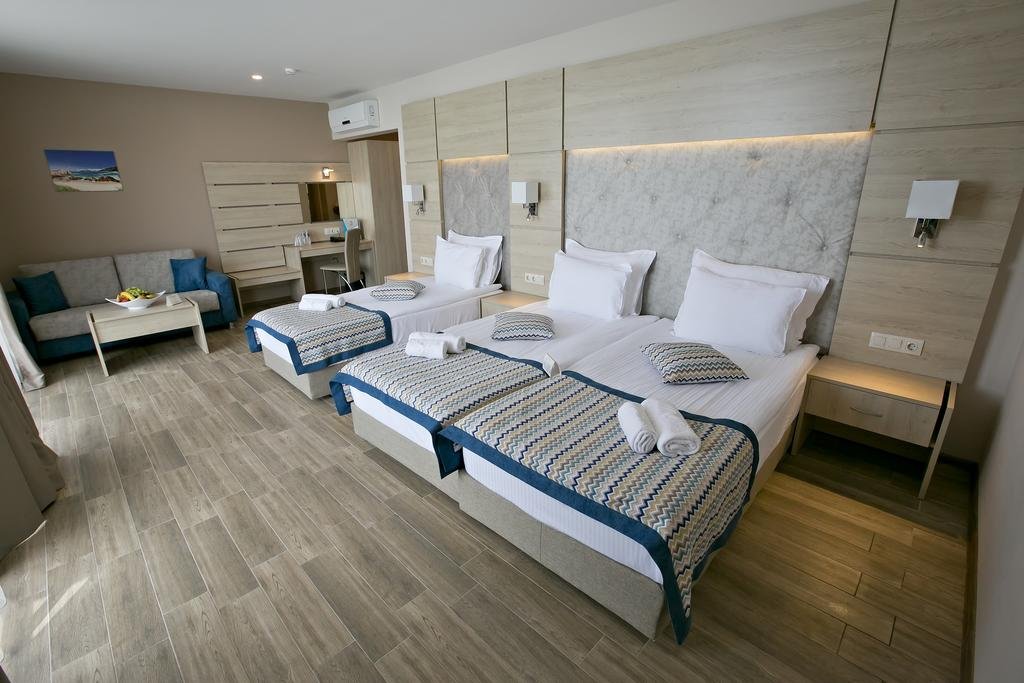 **** Hotelul Royal Grand este situat pe plaja de pe coasta Marii Negre, in orasul Kavarna. Distanta pana la Varna este de 45 km. Distanta pana la Balcic - 18 km, distanta pana la centrul orasului Kavarna - 2 km. Facilitati Construita in 2018, o cladire de hotel pe 6 etaje. Receptie, restaurant cu terasa si vedere la mare, lobby bar, plaja privata, bar pe plaja, piscine (exterior si interioare), sala de conferinte cu echipament pentru 180 de persoane, fitness, centru SPA, masaj, medic la garda, serviciu de spalatorie. *Nu exista camere potrivite pentru persoane cu dizabilitati. Animalele de companie nu sunt permise. Cazare Check in: ora 14:00; Check out: ora 11:00 In total 137 de unitati. Double Deluxe Room park view (max 2+1): Suprafata aproximativa de 26 mp. Au doua paturi obisnuite sau un pat dublu, terasa cu vedere la parc, aer conditionat individual, TV 32 inchi, cablu TV, telefon, mini-frigider (gol, folosit gratuit), Wi-Fi gratuit, seif gratuit, baie cu dus. , uscator de par.Ocuparea maxima este de 2 adulti si 1 copil sau 3 adulti (3 adulti sunt acceptati, dar nu sunt recomandate si nu se accepta reclamatii legate de spatiu si confort). Double Deluxe Room sea side (max 2+1): Suprafata aproximativa de 26 mp. Au doua paturi obisnuite sau un pat dublu, terasa cu vedere LATERALA la mare, aer conditionat individual, TV 32 inchi, cablu TV, telefon, mini-frigider (gol, folosit gratuit), Wi-Fi gratuit, seif gratuit, baie cu dus, uscator de par.Ocuparea maxima este de 2 adulti si 1 copil sau 3 adulti (3 adulti sunt permisi, dar nerecomandati si nu se accepta reclamatii legate de spatiu si confort). Double Deluxe sea (max 2+1): pat twin sau dublu, canapea extensibila. Suprafata aproximativa de 26 - 30 mp. Au doua paturi obisnuite sau un dormitor, terasa cu vedere frontala la mare, aer conditionat individual, TV 32 inchi, cablu TV, telefon, mini-frigider (gol, folosit gratuit), Wi-Fi gratuit, seif gratuit, baie cu dus. , uscator de par.Ocuparea maxima este de 2 adulti si 1 copil sau 3 adulti (3 adulti sunt acceptati, dar nu sunt recomandate si nu se accepta reclamatii legate de spatiu si confort). Family Room (max 3+1): Suprafata aproximativa de 50 mp. Aceasta este o camera mare si exista 3 paturi obisnuite si un fotoliu extensibil, balcon cu vedere la mare sau la parc/in functie de ocupare/, aer conditionat individual, TV (32 inchi), TV prin cablu, seif gratuit, mini-frigider ( gol, folosit gratuit), telefon, Wi-Fi gratuit, baie cu dus si uscator de par. Capacitatea maxima este de 2 adulti si 2 copii sau 3 adulti si 1 copil. Apartments (max 3+1, 4+0): Suprafata aproximativa de 58 mp. Exista un dormitor cu doua paturi separate, despartit printr-o usa, un living cu o canapea extensibila, balcon cu vedere la mare sau la parc/in functie de ocupare/, aer conditionat, TV (32 inch), cablu TV, telefon, mini frigider (gol, folosit gratuit), Wi-Fi gratuit, seif gratuit, baie cu dus, uscator de par. Maxim Capacitatea este de 4 adulti. *Patutul este oferit gratuit la cerere prealabila. Sport & SPA Hotelul ofera piscina interioara cu apa minerala calda, piscina exterioara. Centrul spa este modern si dotat luxos. Centrul spa functioneaza cu apa minerala la o temperatura constanta de 27-30 de grade. Zona de relaxare include o sauna finlandeza, o camera de sare, o baie de aburi, sauna pe baza de plante, terapie cu galeata, dusuri de aventura si un centru de fitness. Animalele de companie mici sunt permise; 30 de leva pe zi. Parcare Parcare nepazita, limitata, contra cost 16 BGN pe zi. Gratuit: sezlonguri si umbrele la plaja hotelului gratuit + beach bar (in limita disponibilitatii)