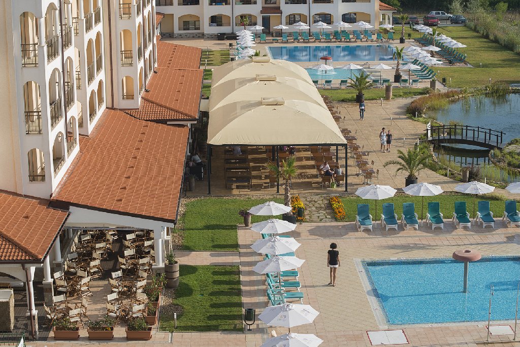 Facilitati: restaurant bufet, restaurant a la carte, snack bar, pastry bar, lobby bar/pool bar, pond bar, beach bar, facilitati pentru copii (loc de joaca in aer liber, miniclub in interior), centru Wellness, fitness, receptie 24/7, programe de animatie si divertisment, 3 piscine. SERVICII CAZARE Check-in dupa ora 15:00 Check-out pana la ora 11:00 Complexul detine in total 290 spatii de cazare, din care 170 apartmente cu 1 si 2 dormitoare sunt localizate in cladirile 1, 3, 4 si 120 camere duble sunt localizate in cladirea 2. Fiecare apartament are un living, chicineta, balcon privat. Camerele duble sunt potrivite pentru familiile cu doi copii. Toate camerele duble si apartamentele au vedere partiala spre mare sau spre zona inconjuratoare.