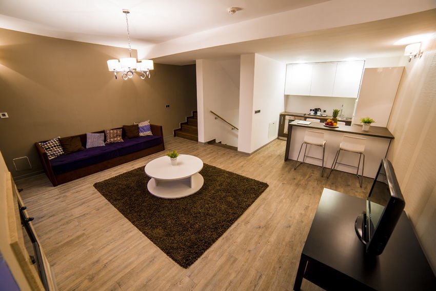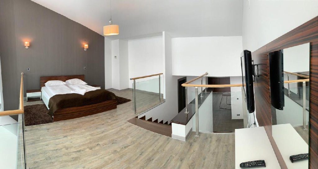 Apartamentele tip penthouse reprezinta perla coroanei. Dispuse pe doua nivele, in diferite combinatii (doua livinguri si doua dormitoare sau un living si trei dormitoare), cazarea intr-un astfel de apartament aduce rasfatul suprem. Luminozitatea, terasele generoase, semineul din living, spatiul generos, eleganta mobilierului va vor transforma sederea intr-o experienta memorabila.
