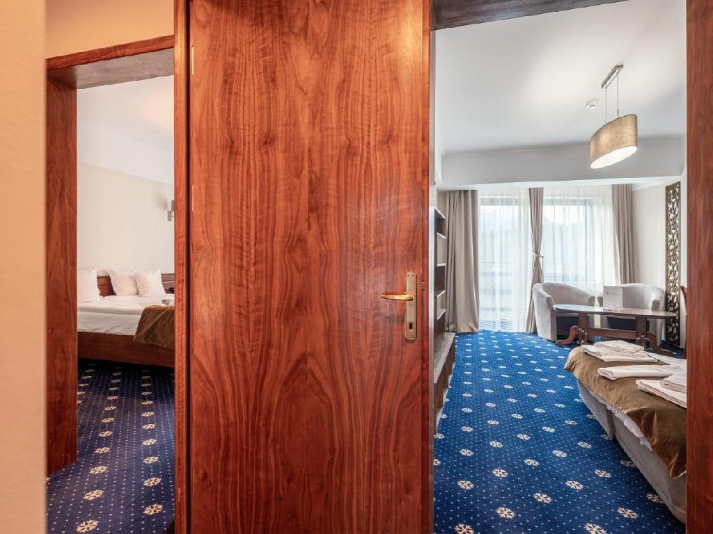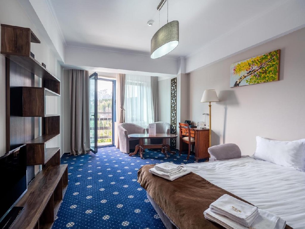 Structuri de cazare: Camerele intrunesc toate standardele unui hotel de 4 stele: minibar, TV cu ecran LCD , WI-FI de banda larga si putere marita, telefon, uscator de par, buton panica si produse cosmetice atent alese. Numarul total de camere este de 29, dintre care : - 3 apartamente: compuse din living cu o canapea extensibila, dormitor cu pat dublu si 2 bai cu cabina de dus. Apartamentele mai au un balcon/terasa. Spatiul permite si amplasarea unui pat suplimentar. - 21 camere duble sau twin, matrimoniale, cu vedere la munte, dintre care 10 cu balcon, camerele matrimoniale au paturi de 200x200 - cu posibilitatea amplasarii de pat suplimentar - 5 camere single la mansarda cu pat de 140x200 a cu posibilitatea cazarii a maxim doua persoane Capacitatea de cazare este de pana la 70 de oaspeti. Privelistea este catre munte, catre partia de schi. Astfel, apartamentele dispun de cate o terasa generoasa. De asemenea, si unele dintre camere sunt dotate cu balcon sau terasa, iar celelalte sunt camere pentru nefumatori.