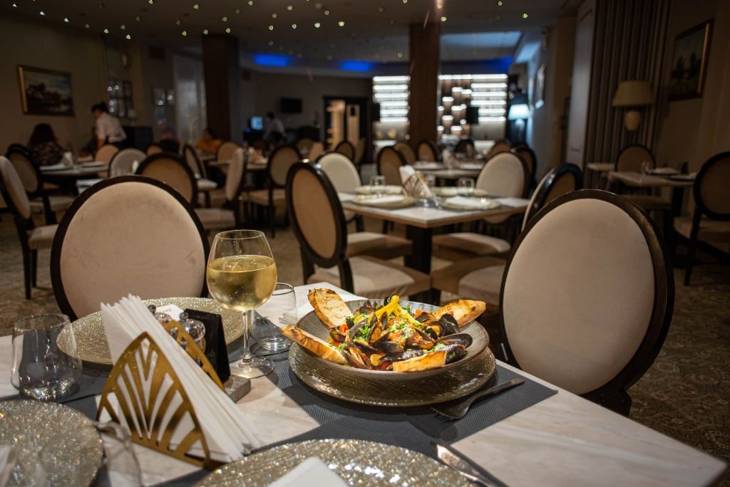 Restaurantul hotelului, avand o capacitate de 150 de locuri, ofera o diversitate de mancaruri rafinate si savuroase, preparate din cele mai proaspete ingrediente.