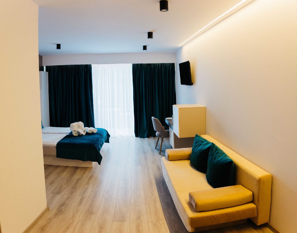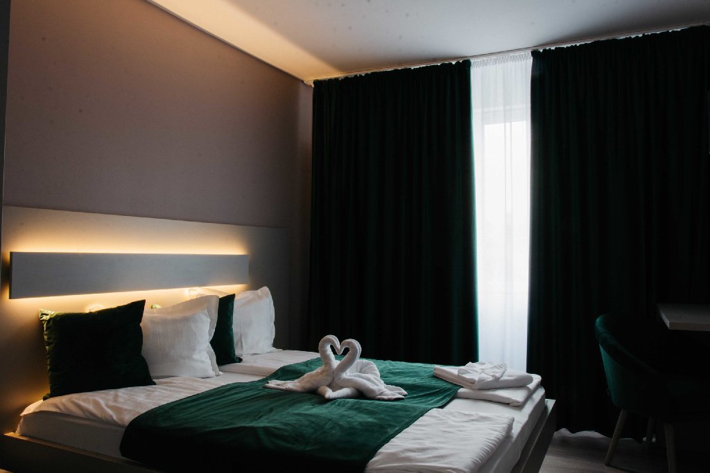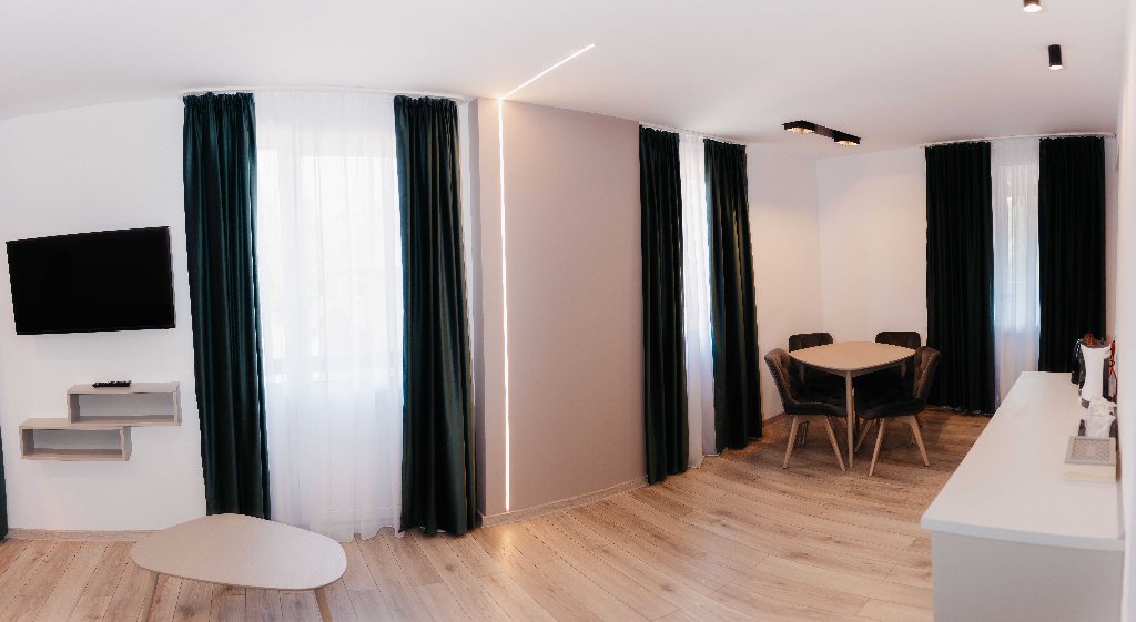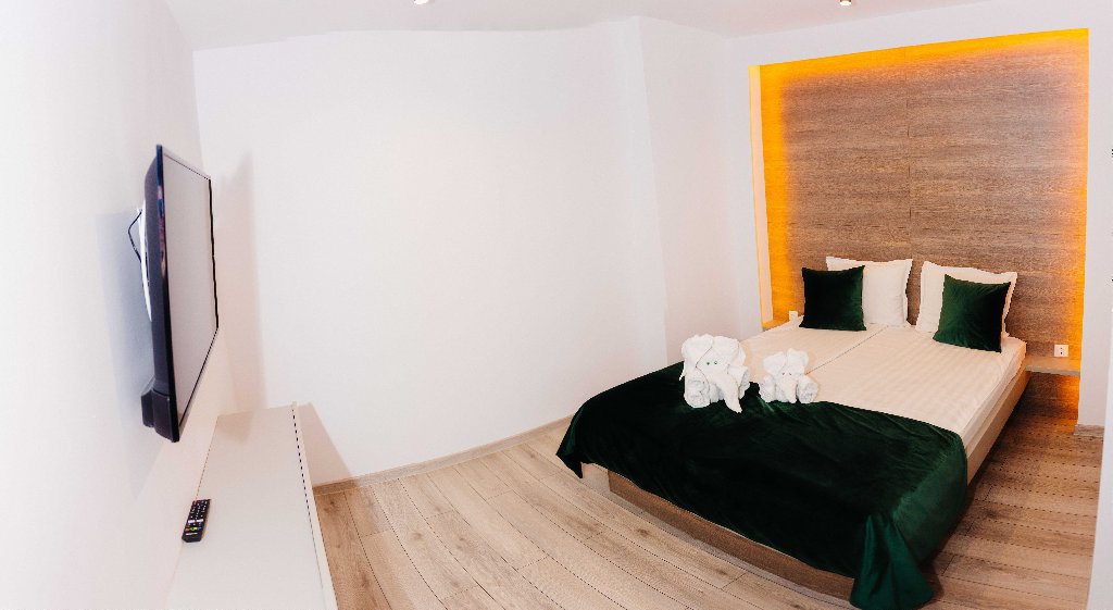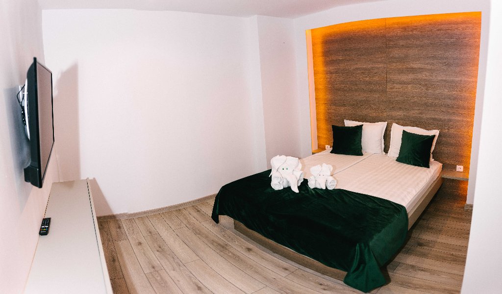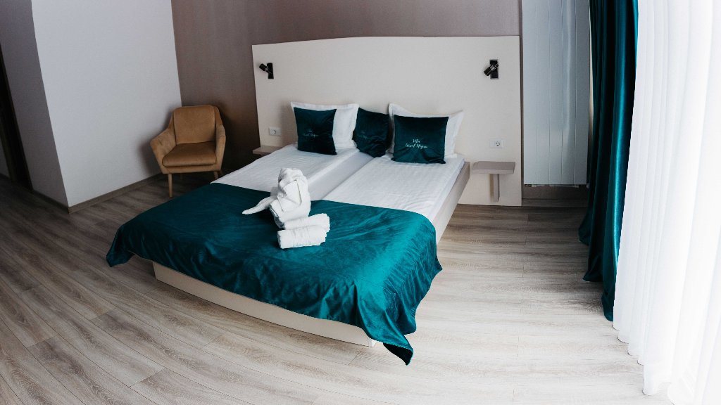 Structurile de cazare disponibile sunt: - Camera dubla deluxe: suprafata de 16 mp si facilitati standard (baie cu dus, papuci de casa, uscator de par, tv prin cablu/satelit, frigider, garderoba si birou). - Camera dubla deluxe cu balcon: suprafata de 16 mp si facilitati standard (baie cu dus, papuci de casa, uscator de par, tv prin cablu/satelit, frigider, garderoba si birou). - Camera dubla deluxe queen: suprafata de 20 mp, dispune de baie cu dus, papuci de casa, uscator de par, balcon/terasa, fierbator pentru apa/filtru de cafea, frigider, garderoba, birou. - Apartament queen: suprafata de 30 mp, dispune de baie cu dus, papuci de casa, uscator de par, frigider, garderoba, birou. Toate camerele pensiunii sunt prevazute cu birou, TV, lenjerie de pat, frigider, papuci de baie, prosoape si baie privata cu cabina de dus.