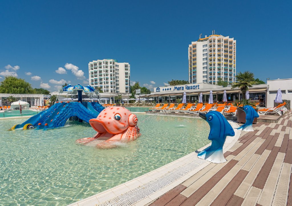 Construit in centrul statiunii, la 100 metri de plaja si in apropierea Lacului Venus, Complex Mera Resort beneficieaza de o pozitionare deosebita, intr-un cadru natural unic, intre mare si lac. Prin calitatea si diversitatea serviciilor, orientate catre satisfacerea celor mai inalte cerinte ale turistului modern, Mera Resort si-a castigat prestigiul pe piata serviciilor de turism din zona. Mera Resort Venus asigura peste 800 de locuri in cele 440 de spatii de cazare, dispuse in 2 hoteluri, Mera Sky si Mera Blue si ansamblul de vile Mera Villas. Mera Sky ofera 206 camere duble, dispuse pe 12 niveluri, in timp ce Mera Blue include 122 camere duble si 18 junior suite, pe 9 niveluri.Cele 2 hoteluri sunt conectate printr-o receptie comuna, un spatiu larg, modern si rafinat, unde stilul si eleganta sunt in stransa legatura cu preocuparea permanenta a intregii echipe Mera pentru confortul si buna dispozitie a oaspetilor sai.